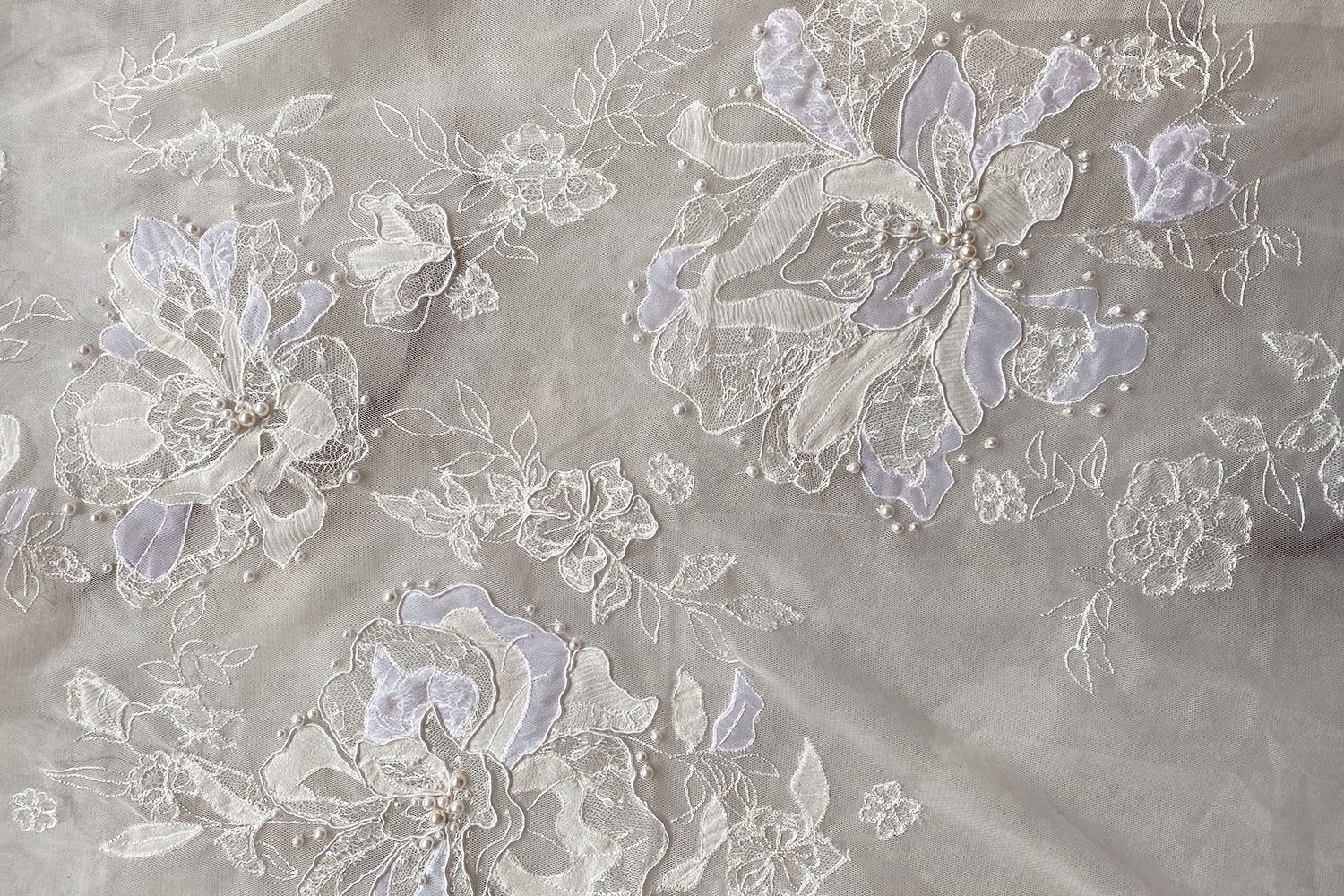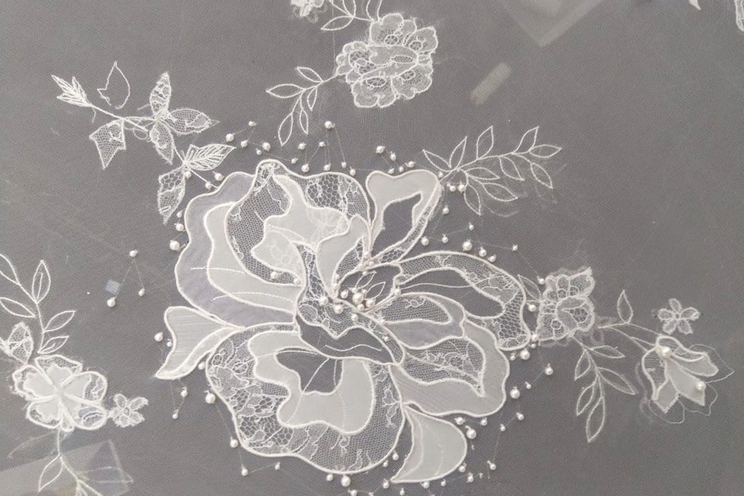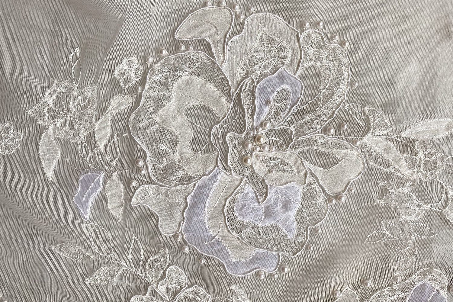 Work in progress images of hand embroidered floral swatches. Hand made Leavers lace, silk crepe de chine & organza is appliquéd on tulle, and finished with pearl beads. The Hermione de Paula atelier creates variations of design and send to Carrie, Alli and her Mother to review.