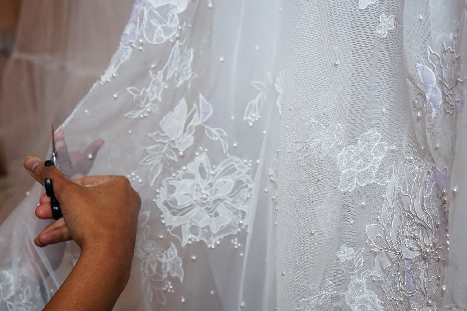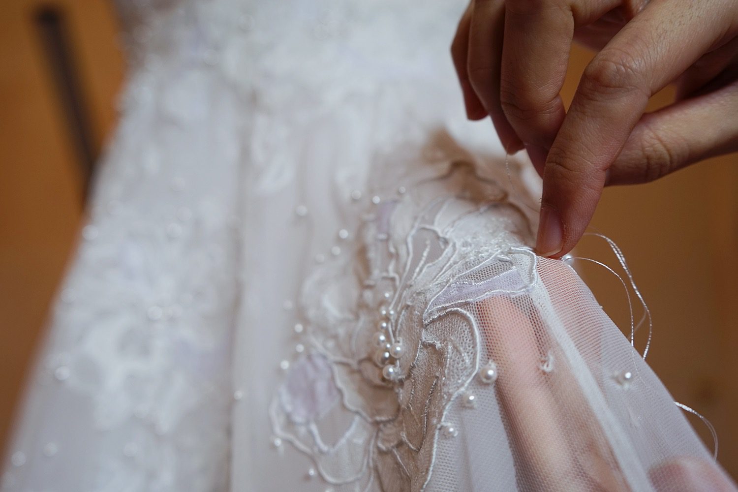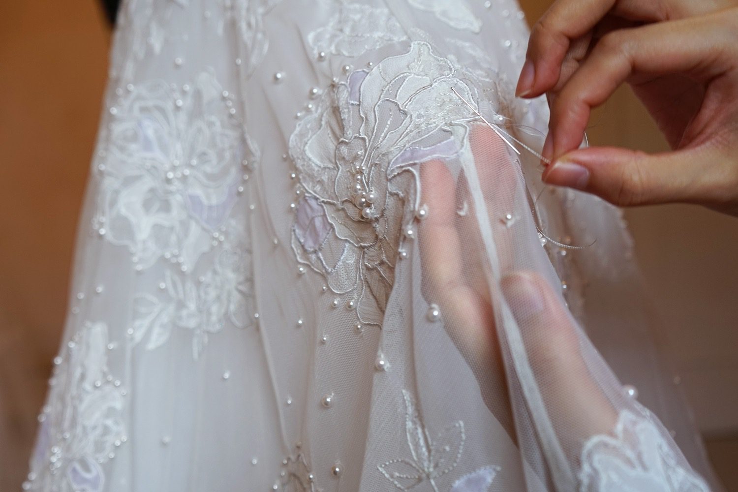 Embroidery is finished by hand to conceal the seams of Alli’s gown. Every single detail is finalised by Hermione de Paula’s talented team of seamstresses.
