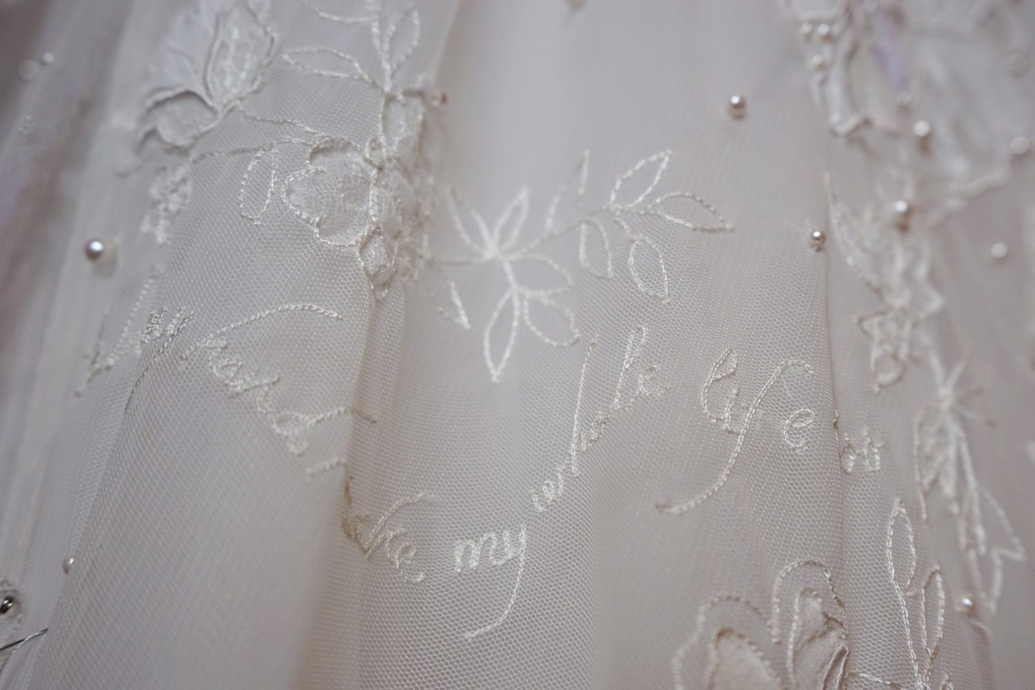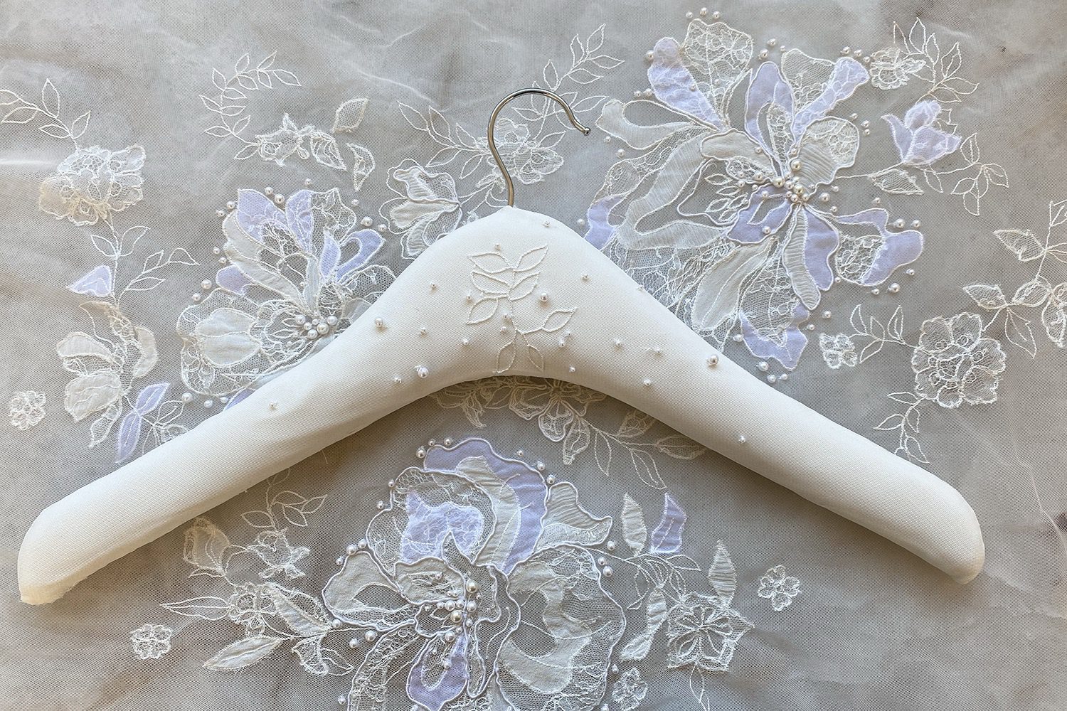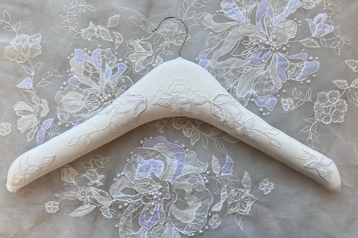 The Hermione de Paula atelier created a hanger with matching embroidery, as a gift from the wedding party to the bride. Alli commissioned a framed picture of her bespoke embroidery, a cherished keepsake & memory of her wedding day.