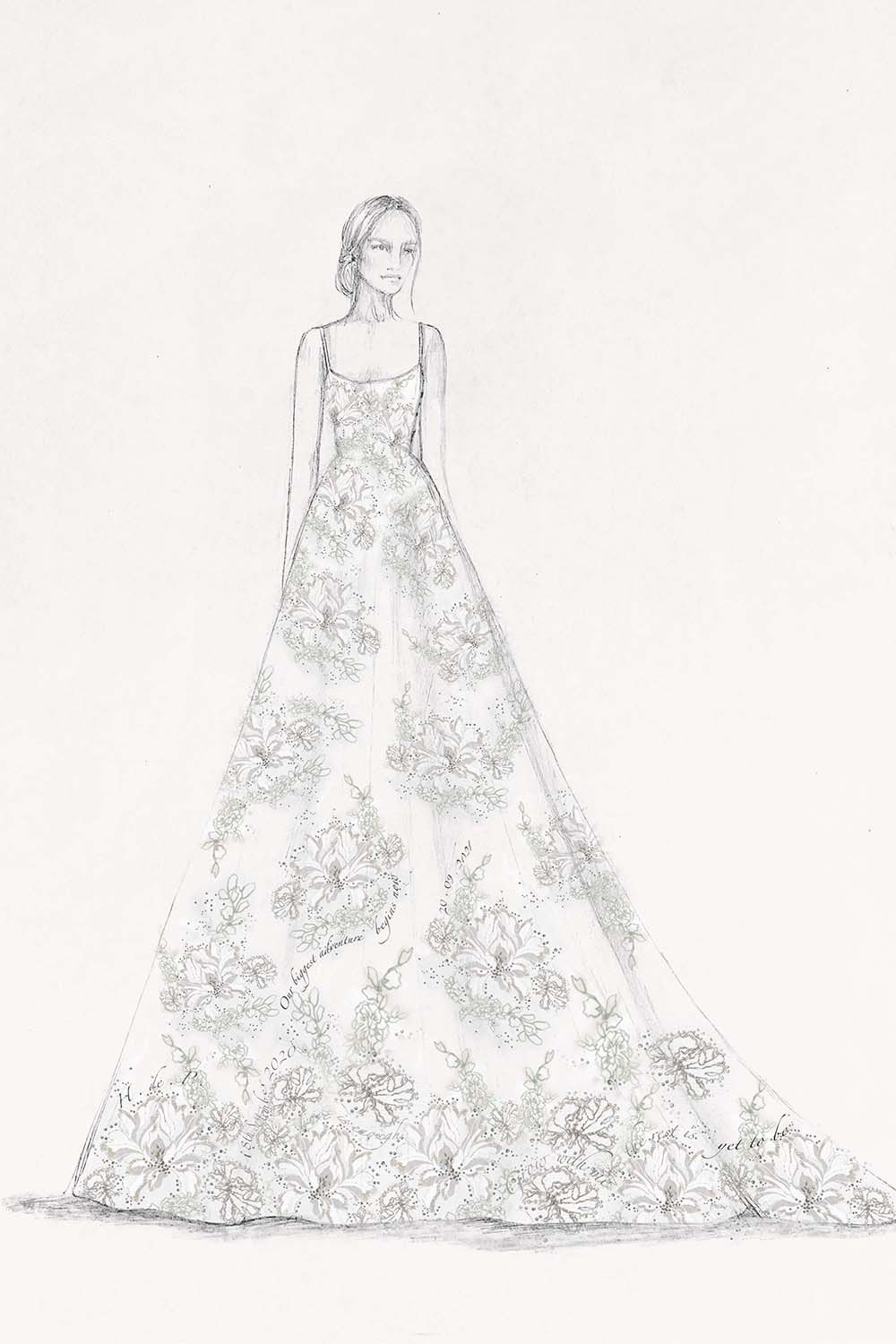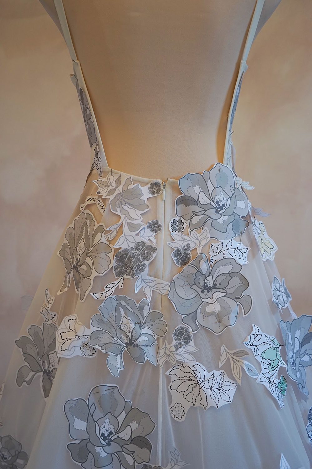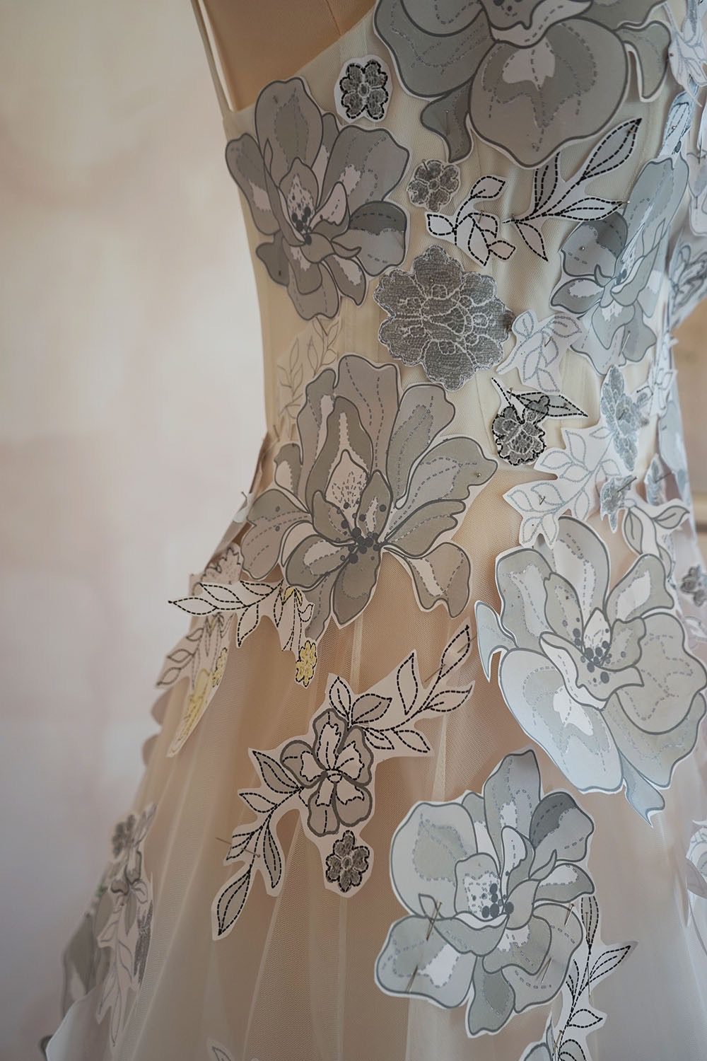 Working with renowned USA stylist Carrie Goldberg, the Hermione de Paula team sketched Alli’s dream silhouette & began working through the concept. Placing the peonies and wild roses, playing with scale. At this stage, we count every pearl and analyse how many hours of work each single flower takes to craft, so we can begin to realise the design from dream to reality, and formalise a proposal for Alli to review, making revisions until it’s perfect.