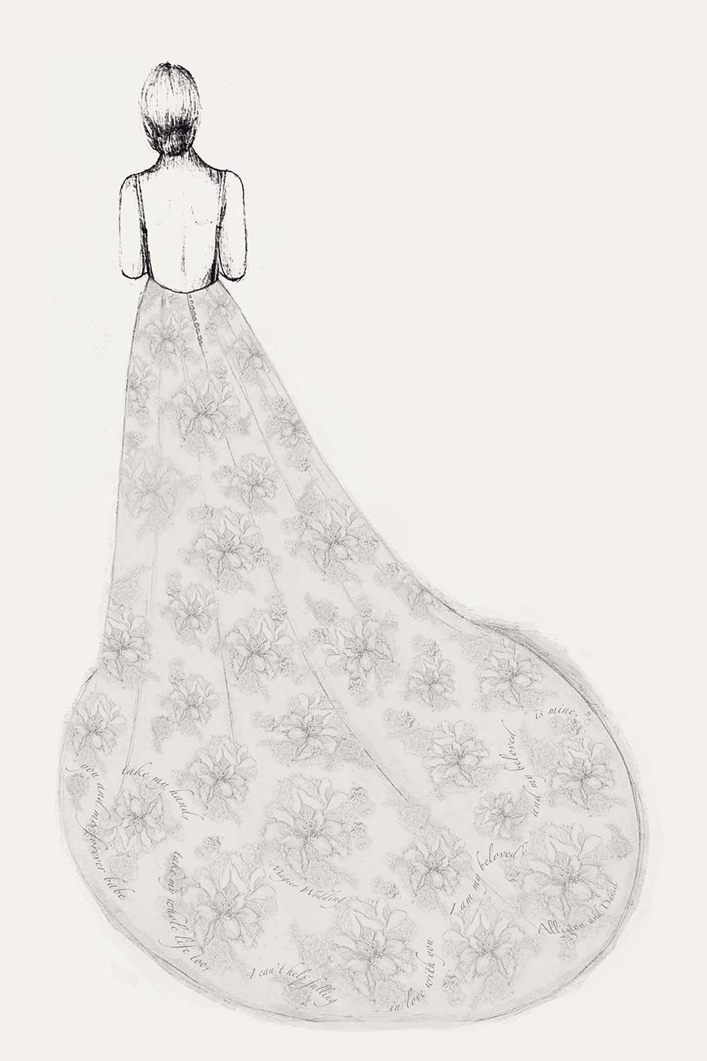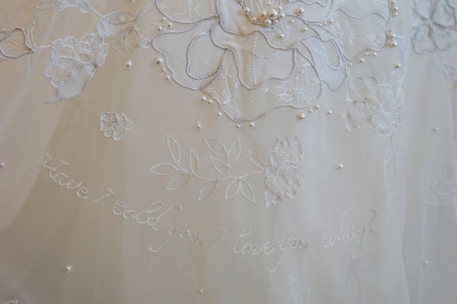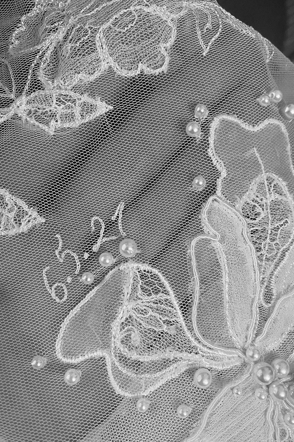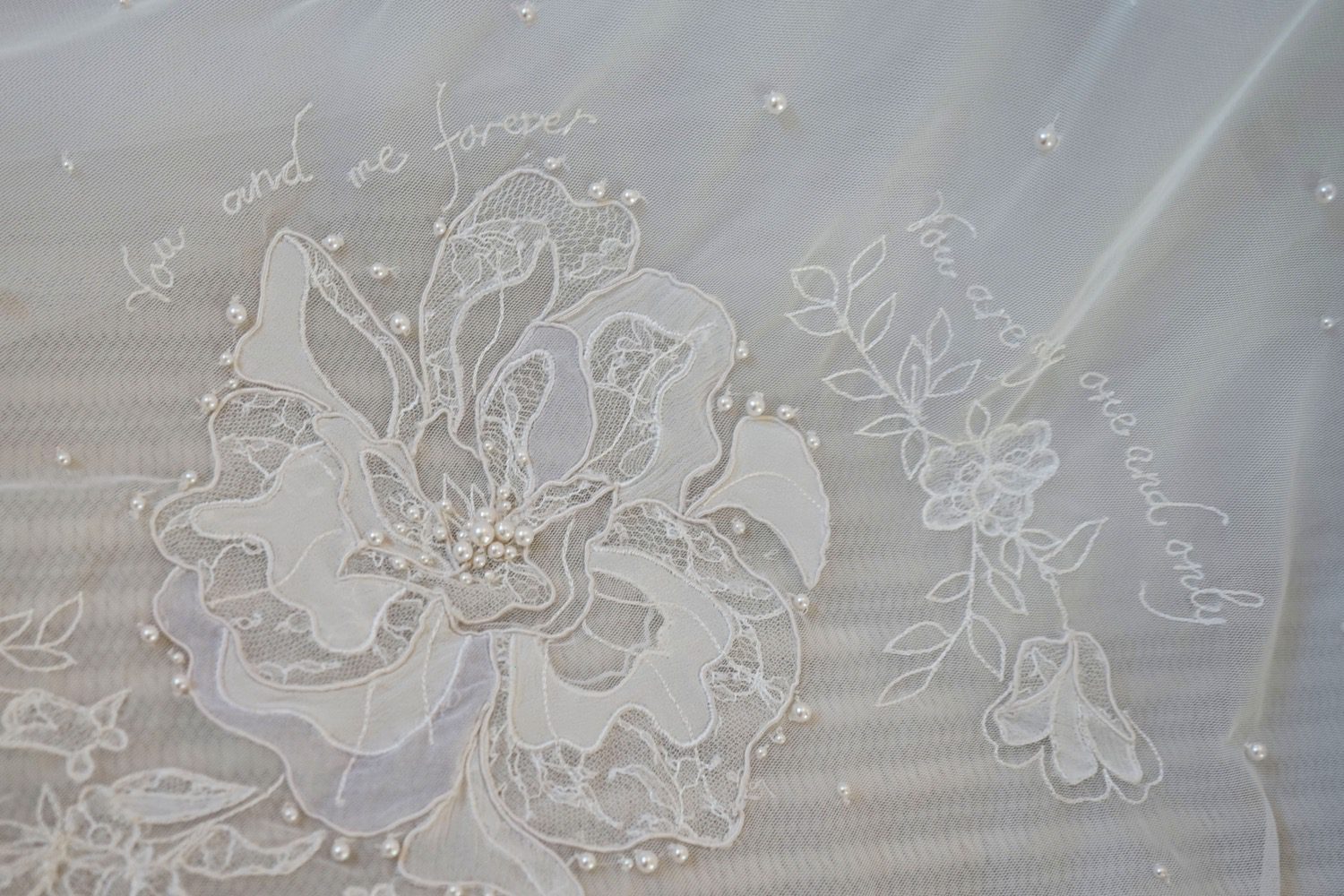 Alli’s brief was ‘Heirloom quality, something classic & timeless with a contemporary twist’. The gown was to be full of special secret messages, entwined around flowers. We created a gown with unique lace appliqué peonies and roses scattered over cascading tulle with a pearl dusting.