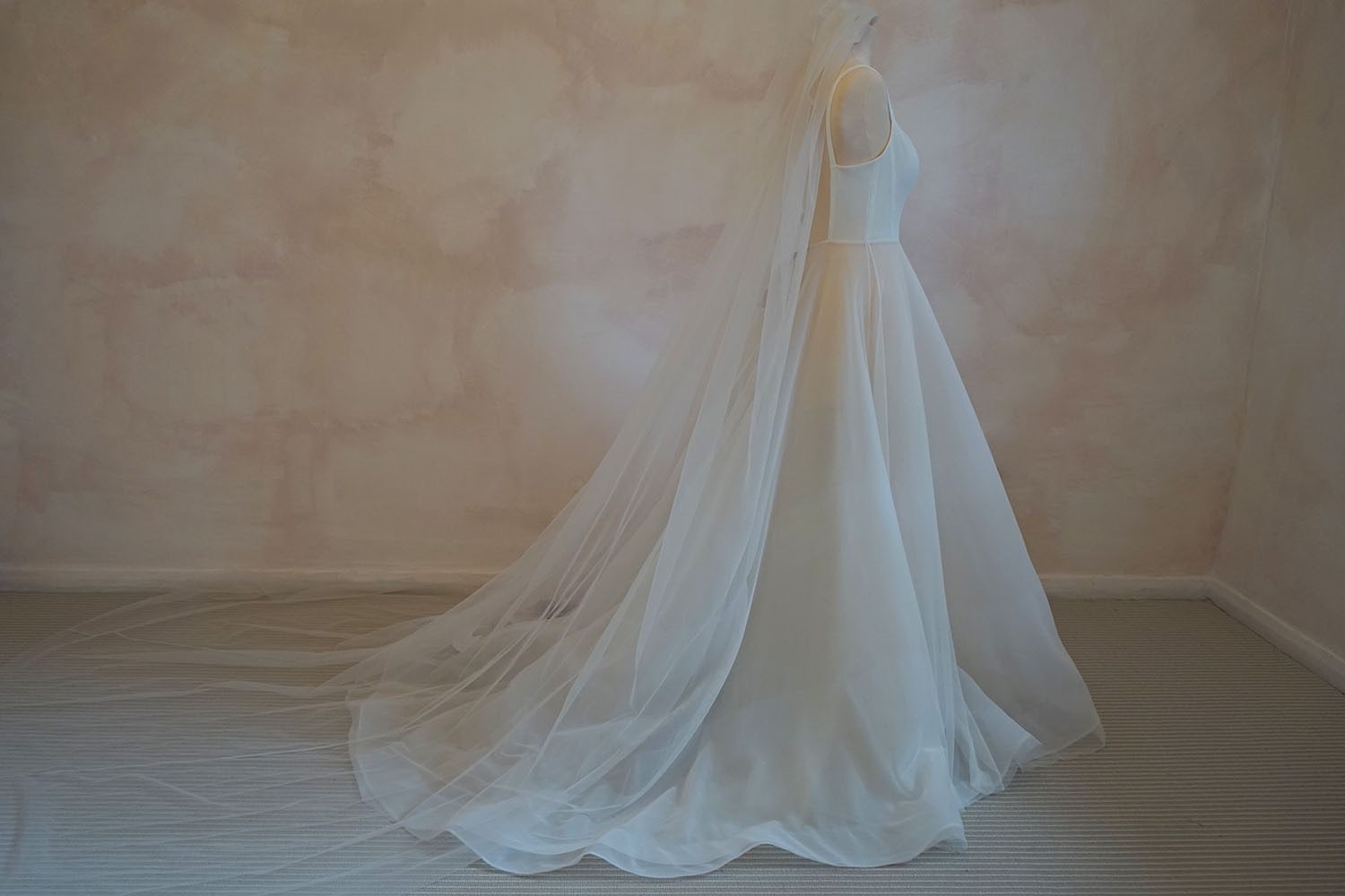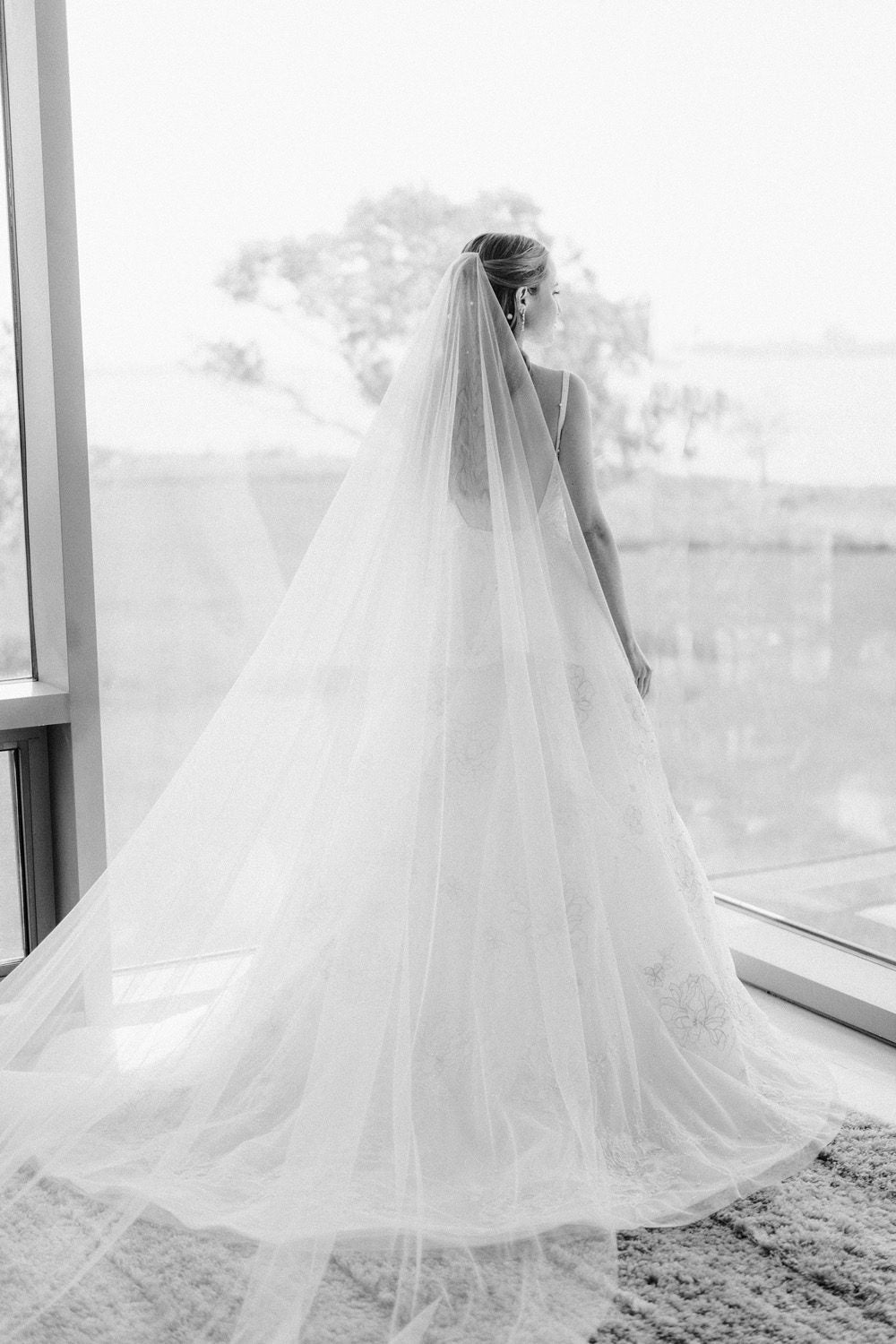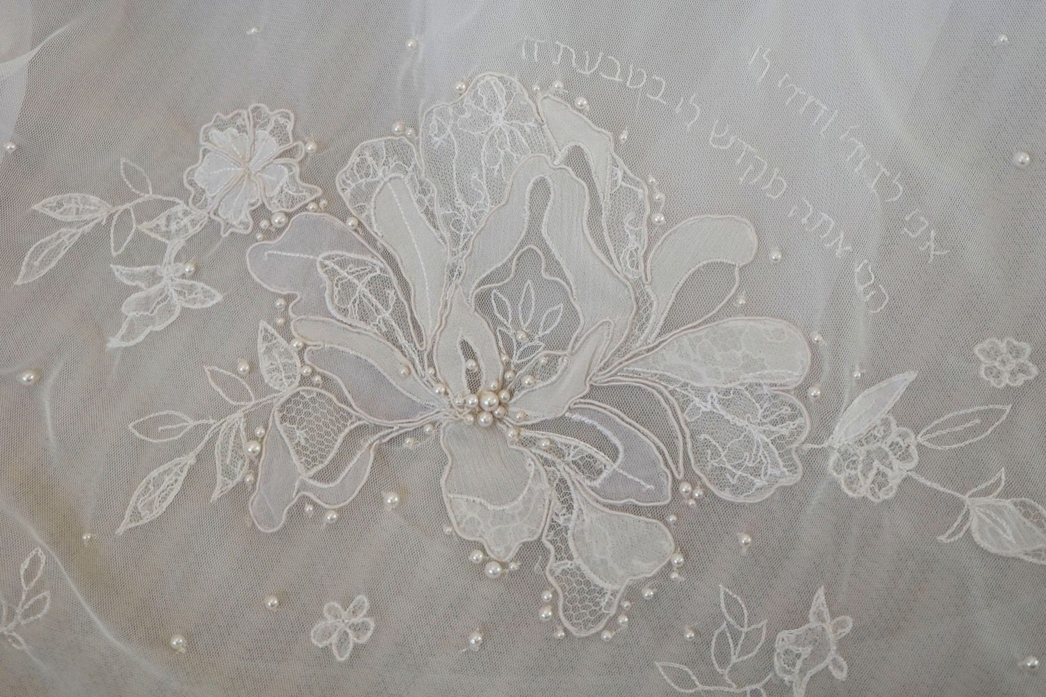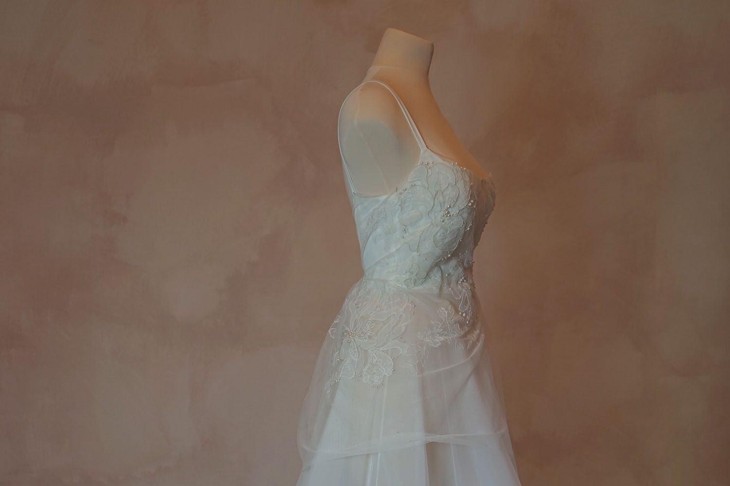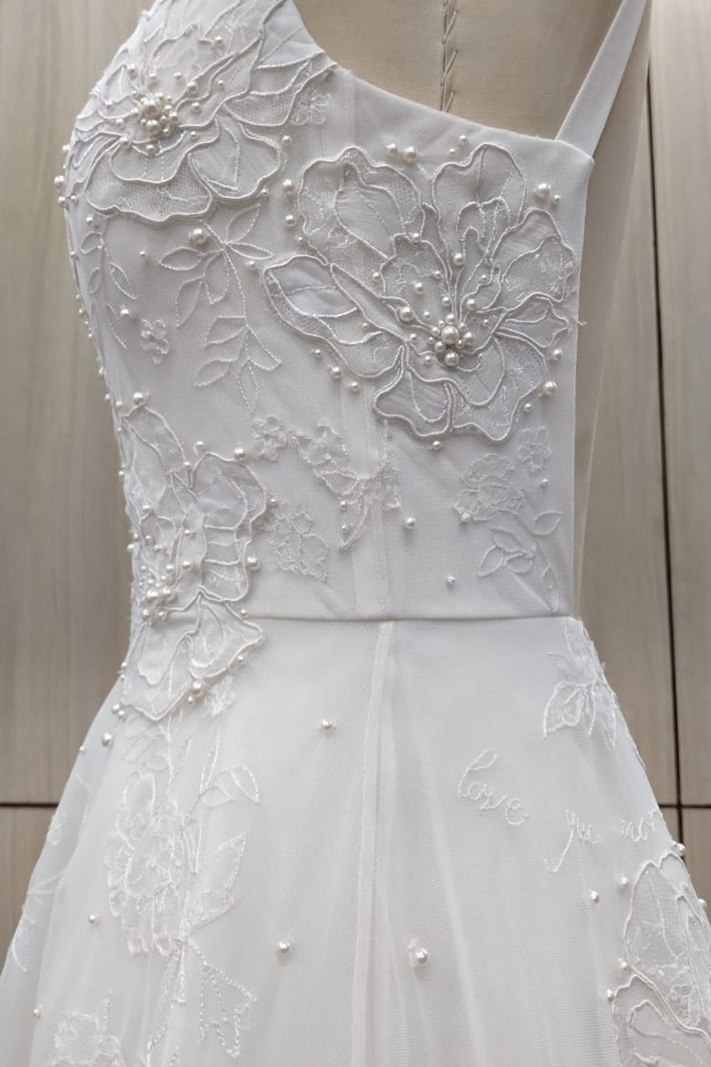 Alli’s brief was ‘Heirloom quality, something classic & timeless with a contemporary twist’. The gown was to be full of special secret messages, entwined around flowers. We created a gown with unique lace appliqué peonies and roses scattered over cascading tulle with a pearl dusting.