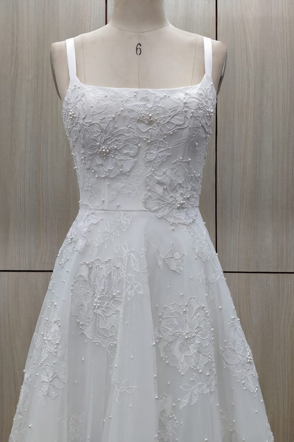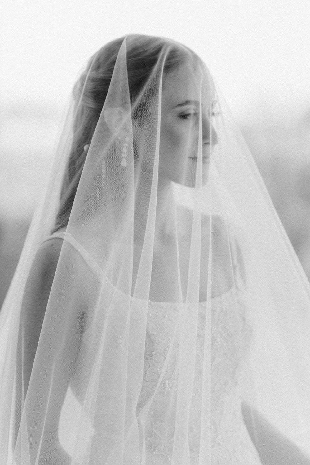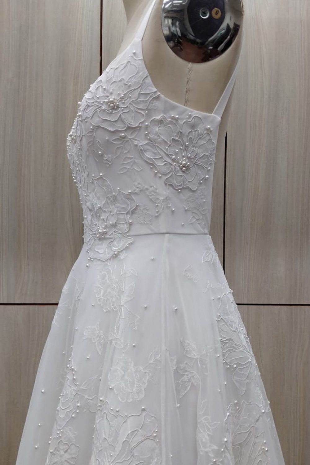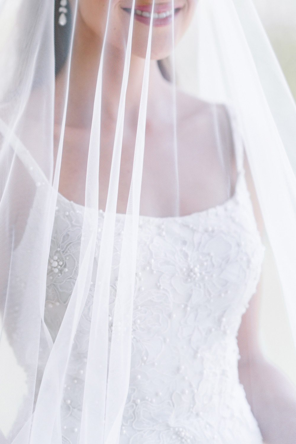 Alli’s brief was ‘Heirloom quality, something classic & timeless with a contemporary twist’. The gown was to be full of special secret messages, entwined around flowers. We created a gown with unique lace appliqué peonies and roses scattered over cascading tulle with a pearl dusting.
