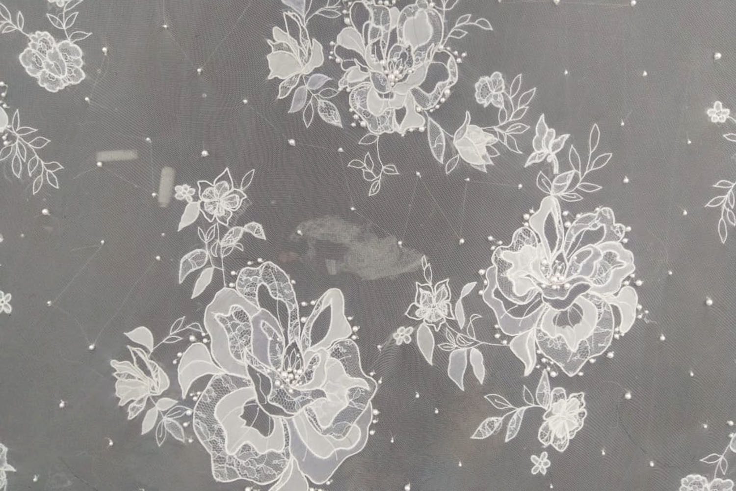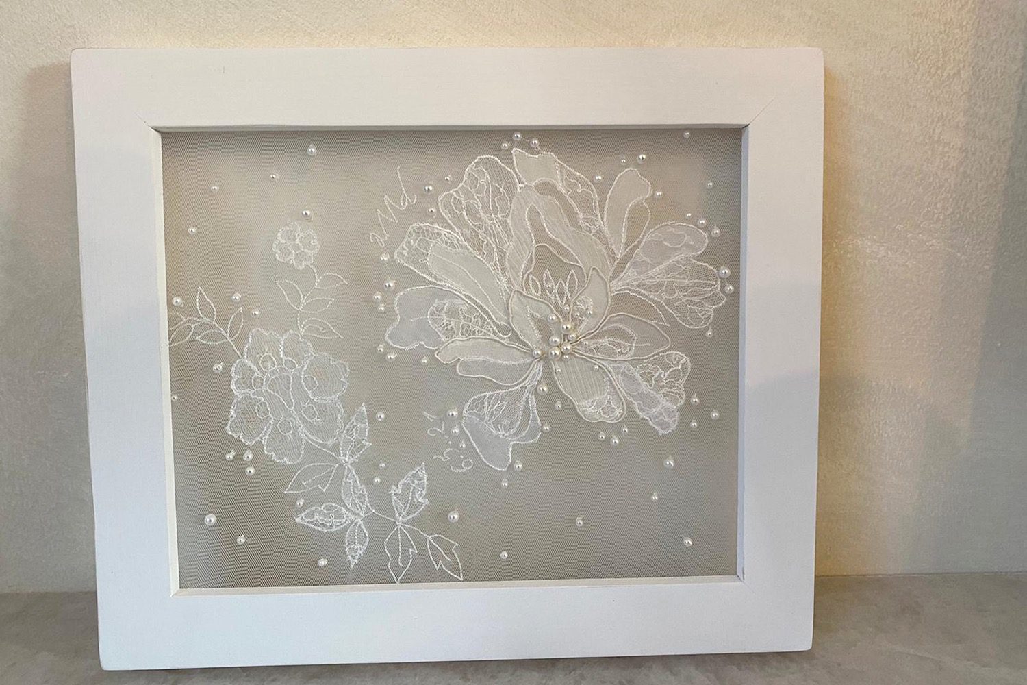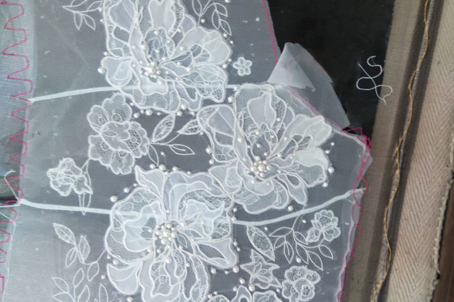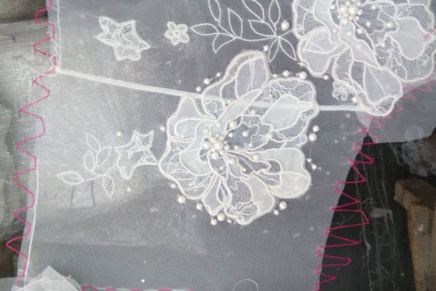 Work in progress images of the lace flowers being hand embroidered onto tulle, on a loom.