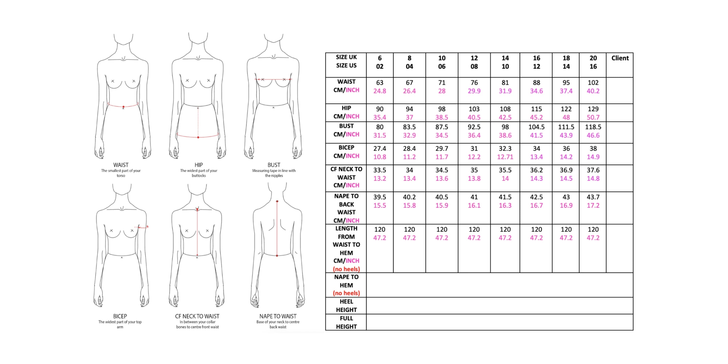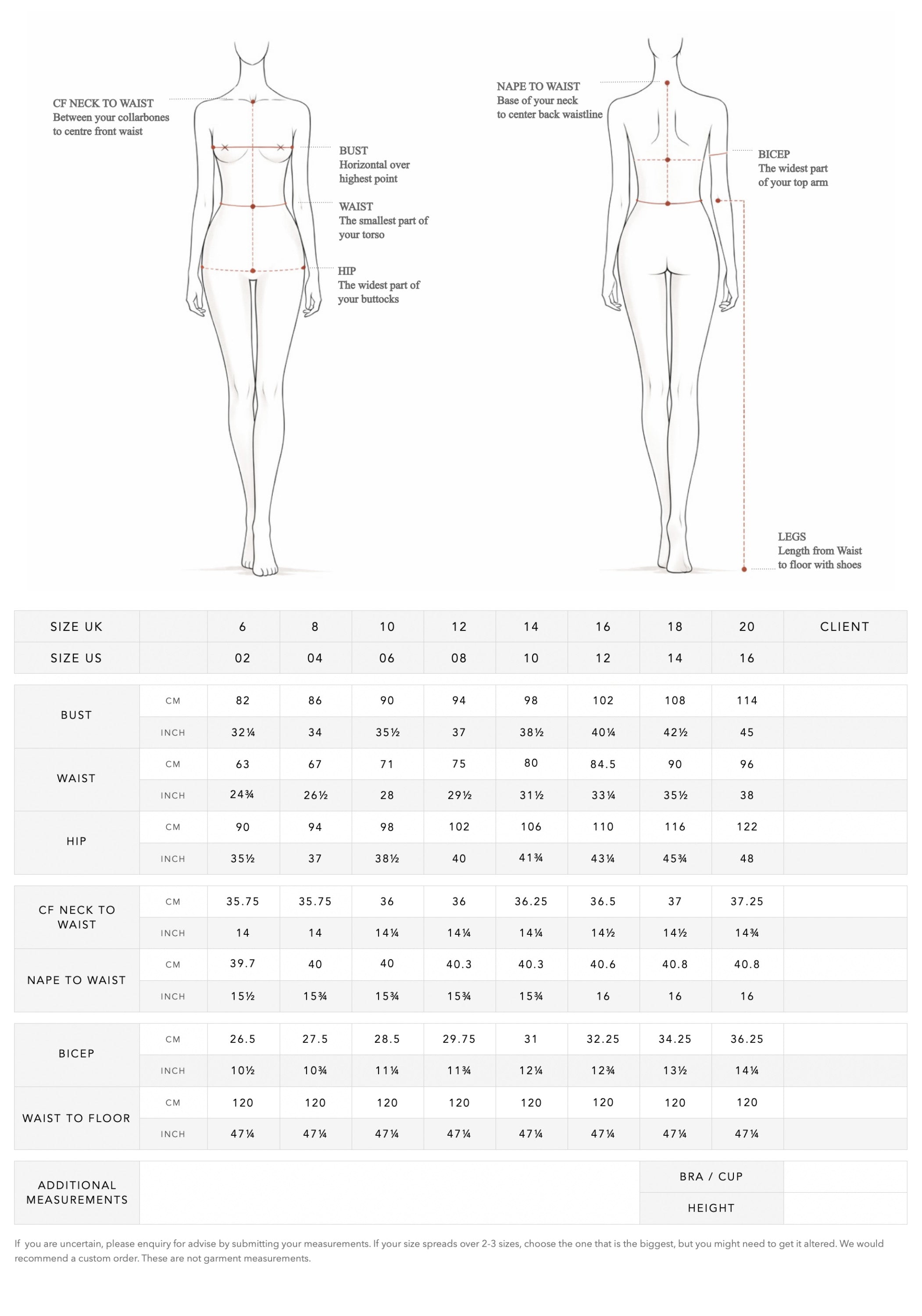 size chart when selecting their gown. Our sizes do not directly correspond to standard high-street or designer sizing, so when enquiring about pricing and fitting advise, please let us know your closest size after referring to our chart below.