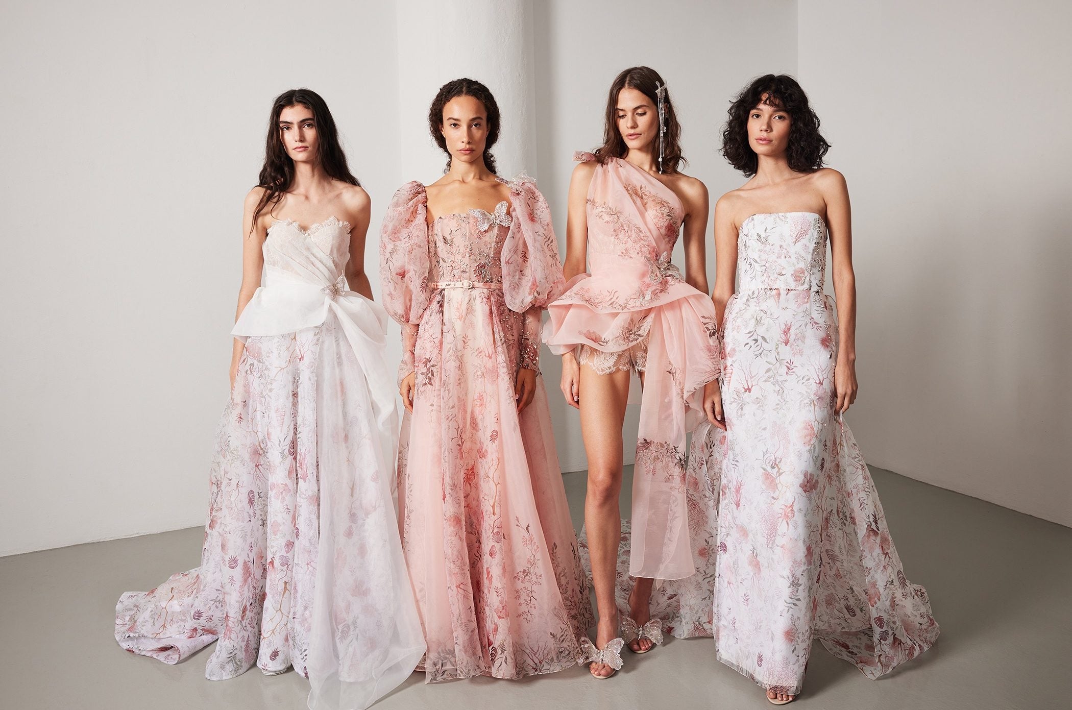 Hermione’s style blends traditional artisan techniques with new and sustainable technologies. Fusing Haute Couture handwriting with a celestial sentiment, appliqué organza blooms, crystal cosmic motifs, and delicately beaded botanical embroideries celebrate the lavish artistry of nature.